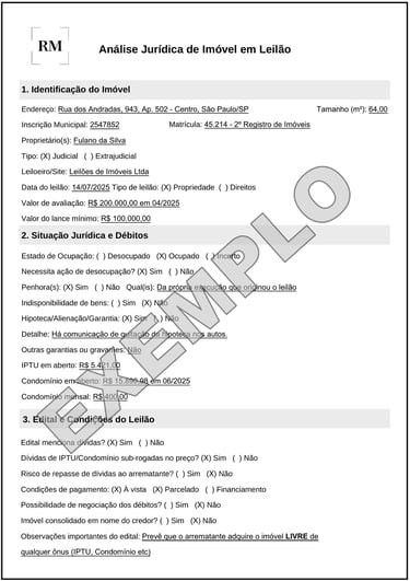Claro, visual, com todos os riscos detalhados, resumo dos débitos, processos, custos totais do arremate, nota de risco e recomendação final.